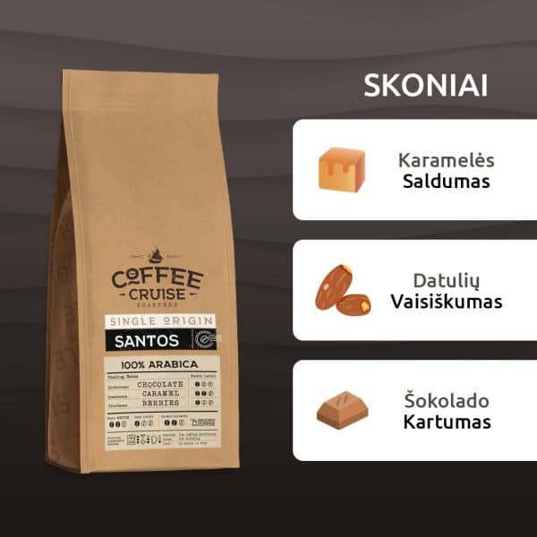 COFFEE CRUISE © SANTOS - 100% arabika, pasižyminti žemu rūgštingumu. Subalansuoto skonio mylėtojus SANTOS kava džiugina šokolado ir vaisių natomis bei maloniai saldžiu karamelėsaromatu. Tai kava, kurioje dominuoja švelnios natos, leidžiančios pajusti sodrų kavos skonį bei užuosti jos aromatą. Iš Brazilijos kilusi Santos vilioja saldumo ir aitrumo deriniu, skatinančiu atrasti naują, šviežią kavą ir ją įvertinti.
