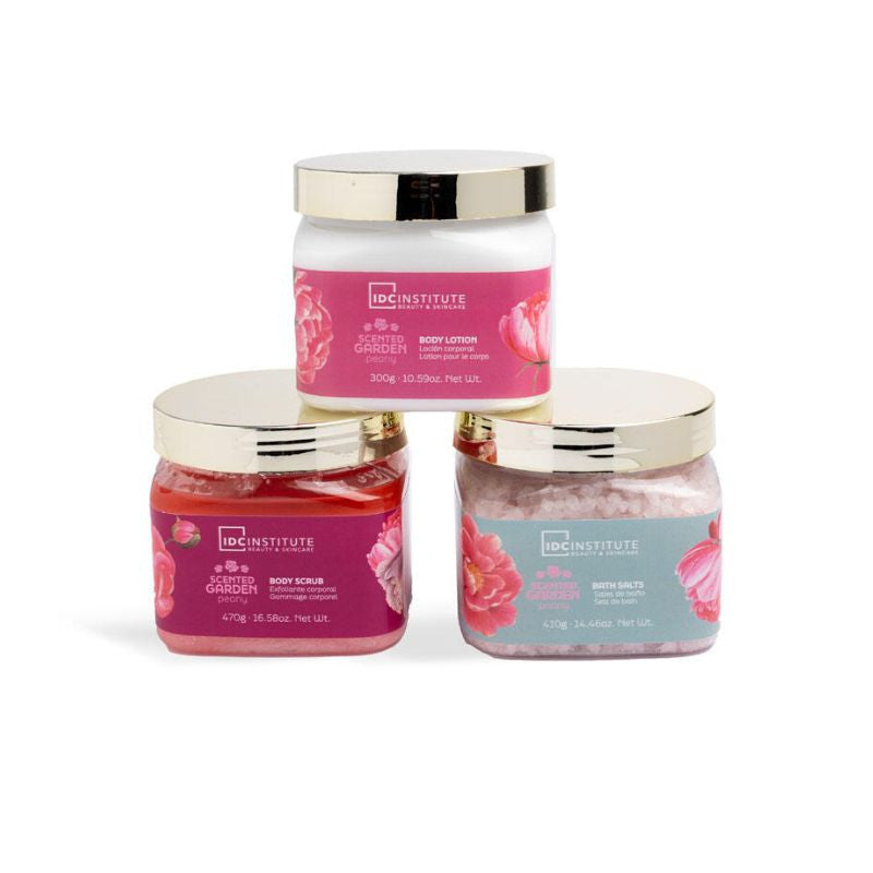 IDC INSTITUTE vonios rinkinys Scented Garden Peony (kūno šveitiklis, vonios druska, kūno losjonas)