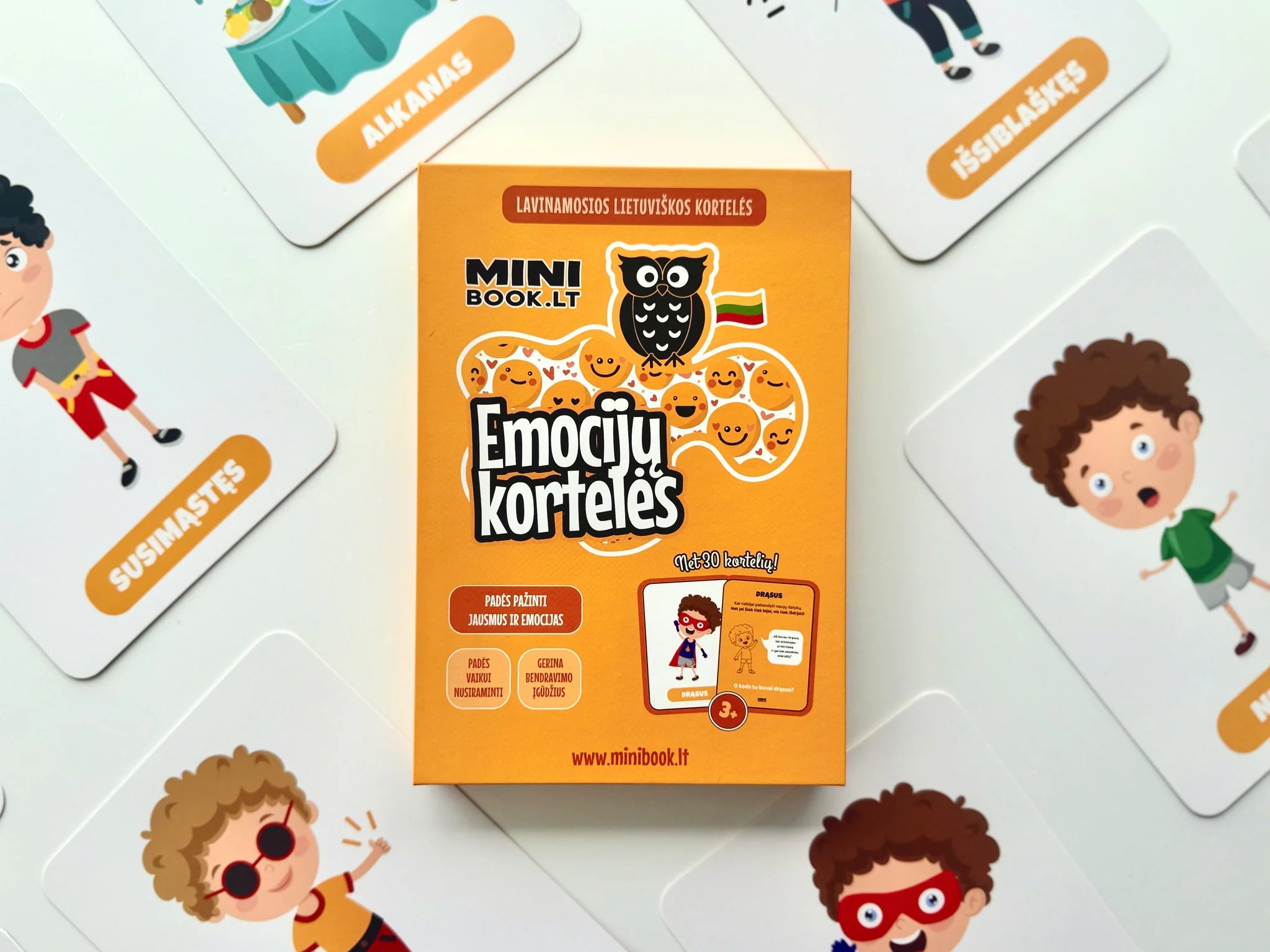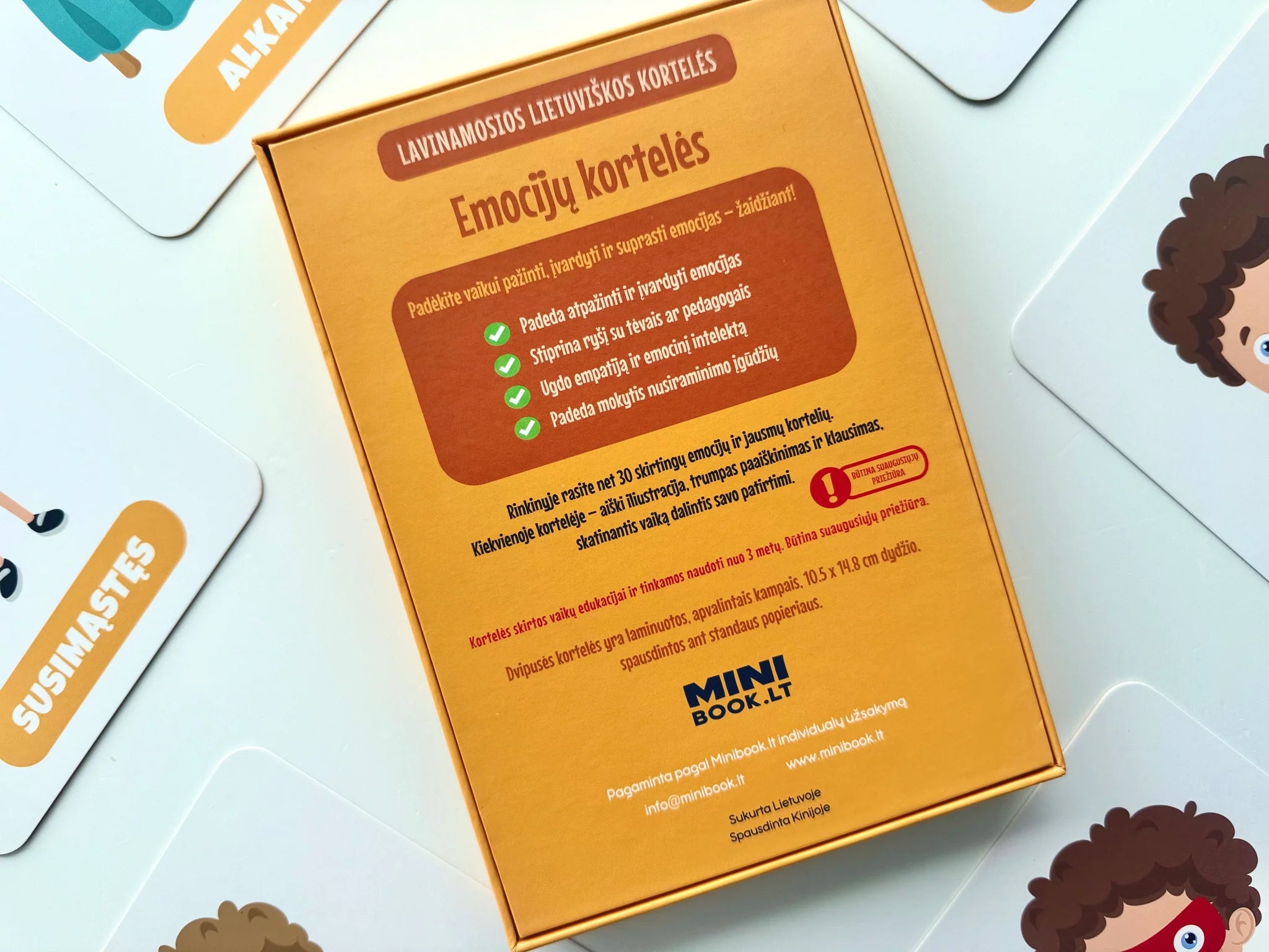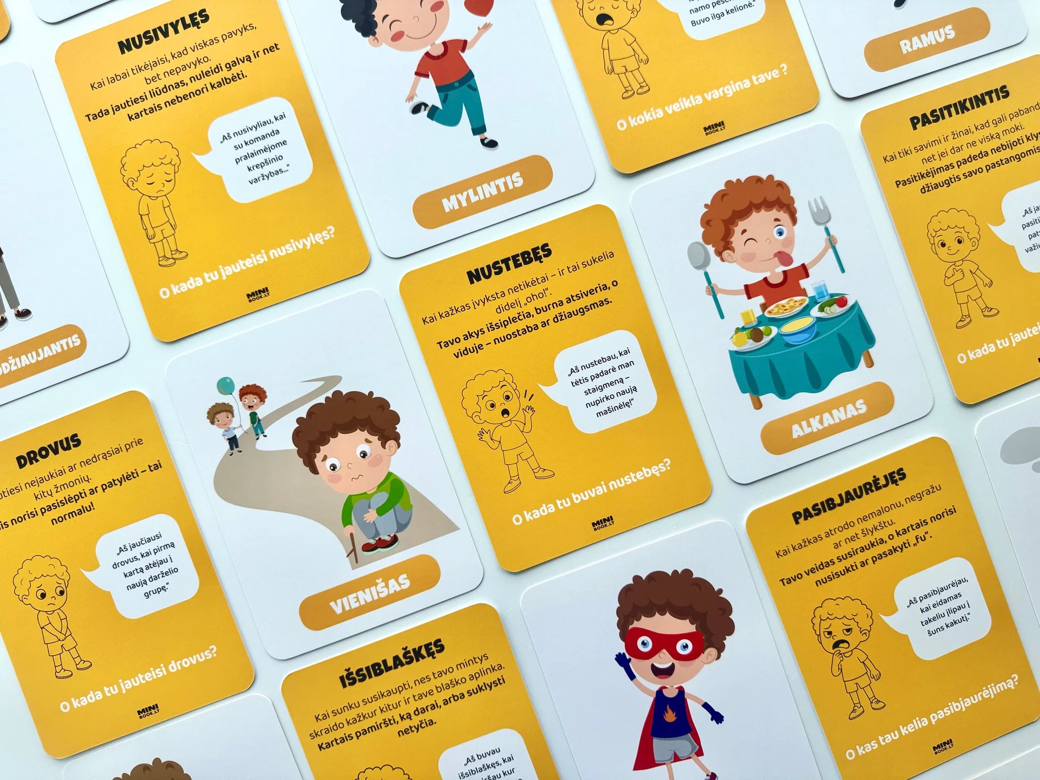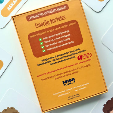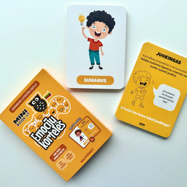 - 30 skirtingų emocijų kortelių (pvz. pyktis, vienatvė, pasididžiavimas, smalsumas ir kt.)