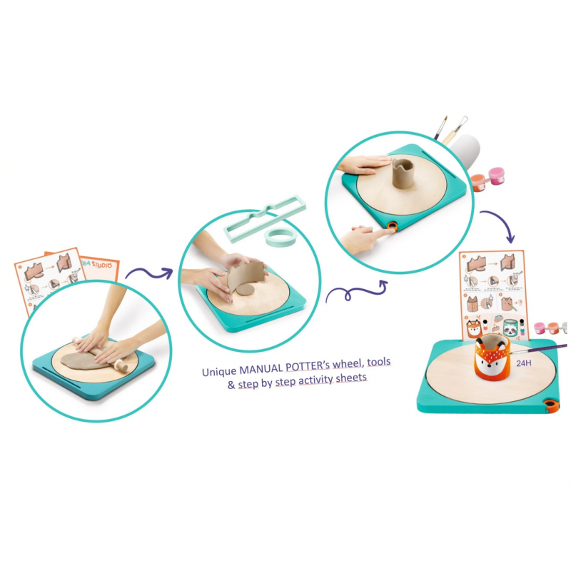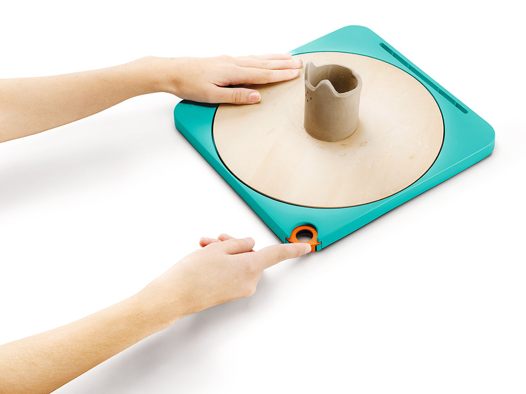 Besisukantis žiedimo rato paviršius yra be variklio ir gali būti užfiksuotas ar atrakintas paprastu mygtuko paspaudimu. Sukdami savo darbą, daug geriau matysite erdvinį kūrinį. Natūrali mediena ir tylus darbas suteikia raminančią ir įtraukiančią meninę patirtį. Šis rinkinys tai – puiki pirmoji mažylių pažintis su keramika.