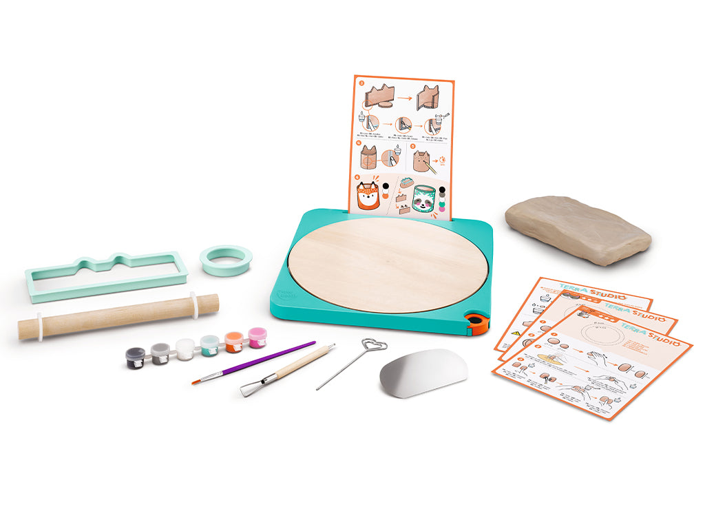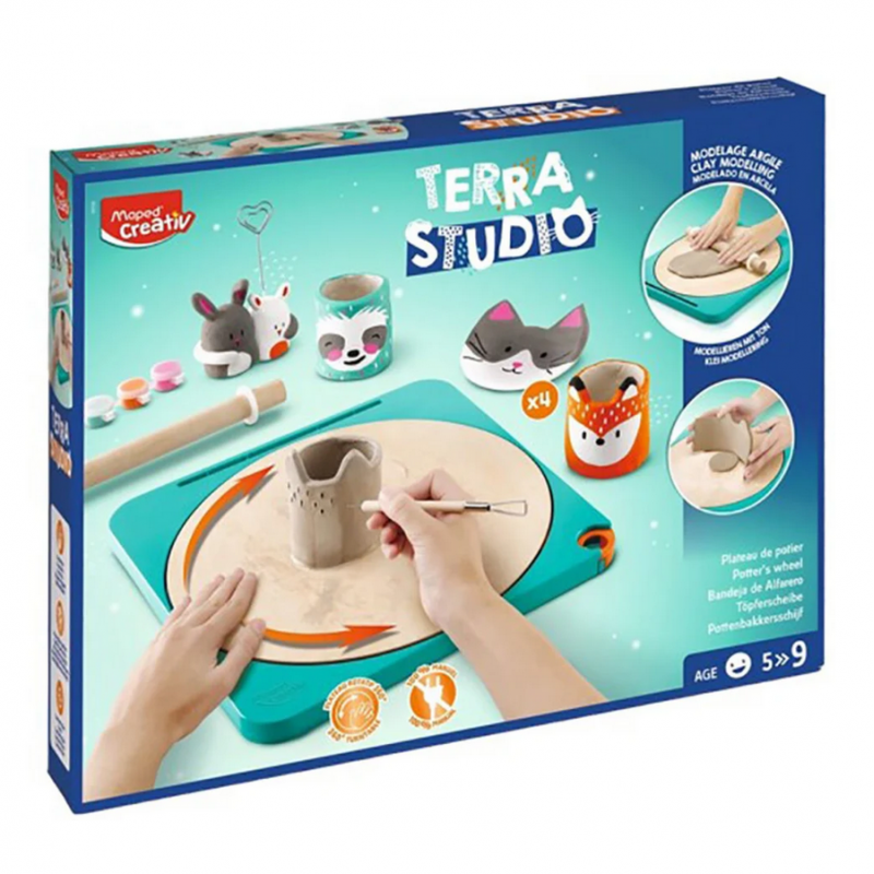 Kruopščiai sukurtas užsiėmimų rinkinys „Maped Creativ Terra Studio“ suteikia vaikams galimybę formuoti, išraižyti ir nudažyti savo molio kūrinius naudojant rankinį medinį žiedimo ratą ir patogius įrankius. Rinkinys yra skirtas skatinti savarankišką žaidimą ir rankų miklumą, jame yra viskas, ko reikia norint sukurti keturis unikalius kūrinius.