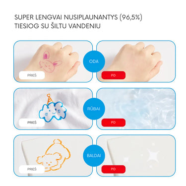 - Lengvas valymas: Vandens pagrindu pagaminti dažai lengvai nuplaunami nuo odos, drabužių ir daugelio paviršių.