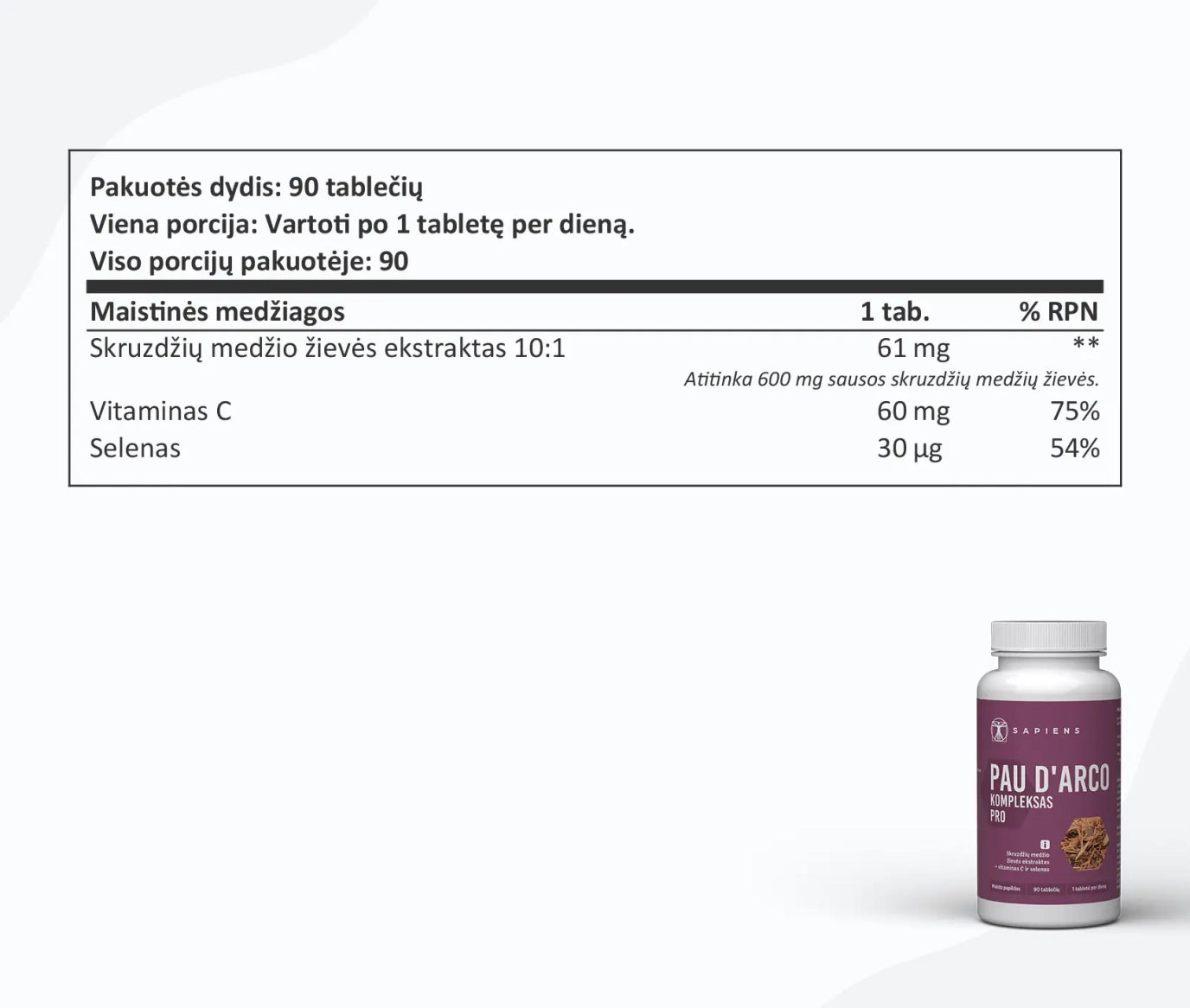 Biologiškai aktyvus Pau D’Arco ekstraktas yra išgaunamas iš penkialapio balamedžio, plačiau žinomo skruzdžių medžio pavadinimu, vidinės žievės. Apie skruzdžių medžio žievės ekstrakto savybes buvo žinoma dar prieš tūkstantmečius. Medžio žievėje yra daug įvairių mineralų, vitaminų ir jų junginių. Šis medis auga Centrinėje ir Pietų Amerikoje, o apie Pau D’Arco ekstraktą žino visas pasaulis! Pau D´Arco kompleksas PRO formulė papildyta selenu ir vitaminu C. Šis papildas sukurtas visiems, kurie siekia papildyti savo gyvenseną bei mitybą Pau D’Arco ekstrakto, seleno ir vitamino C deriniu.
