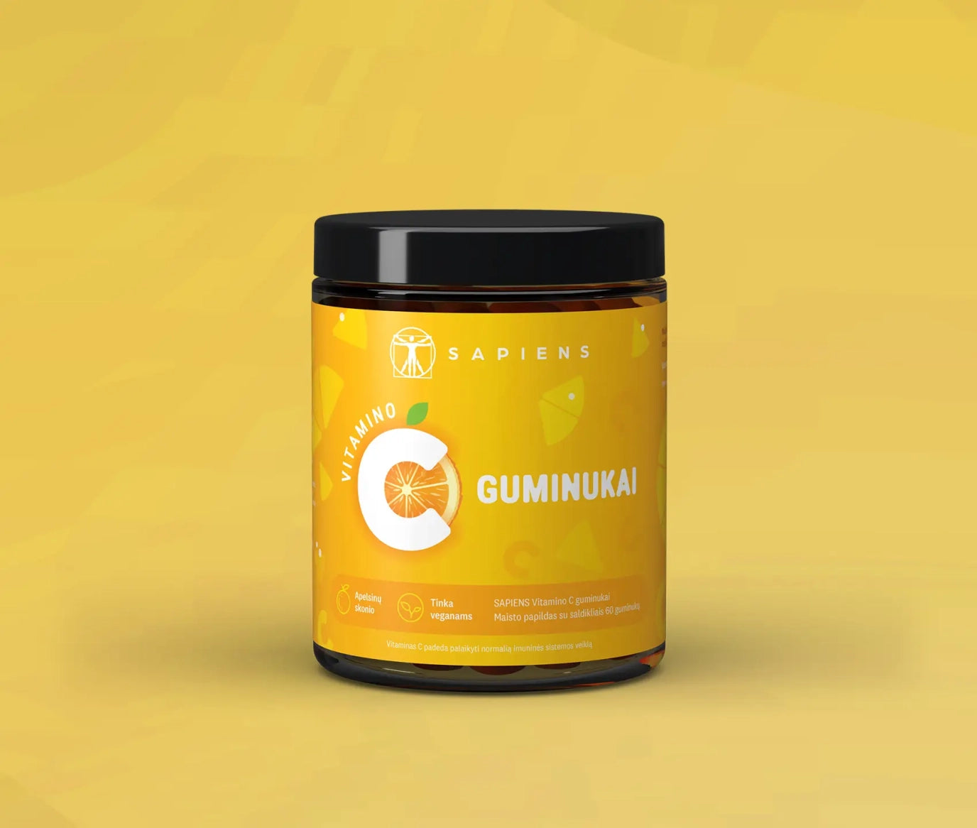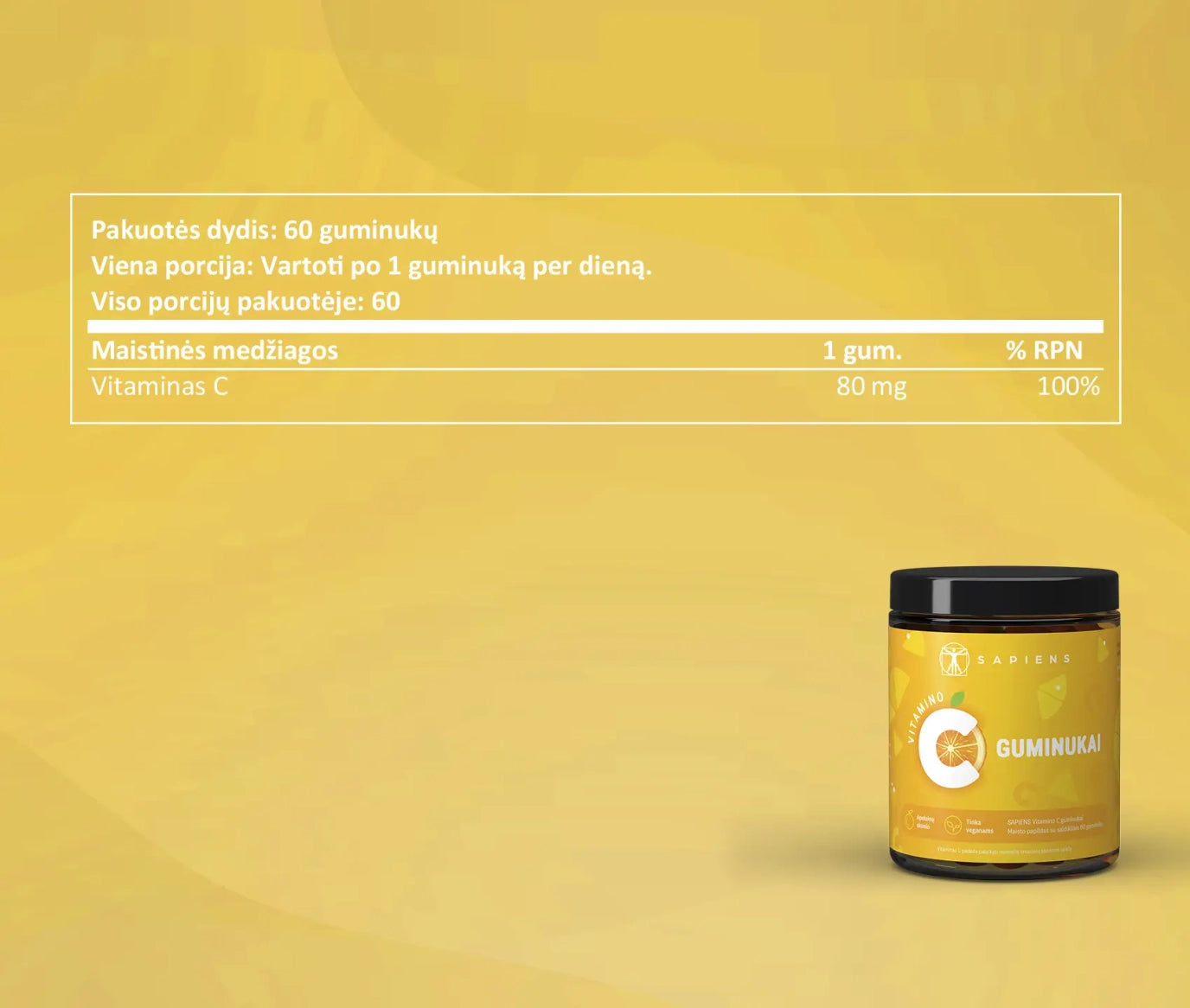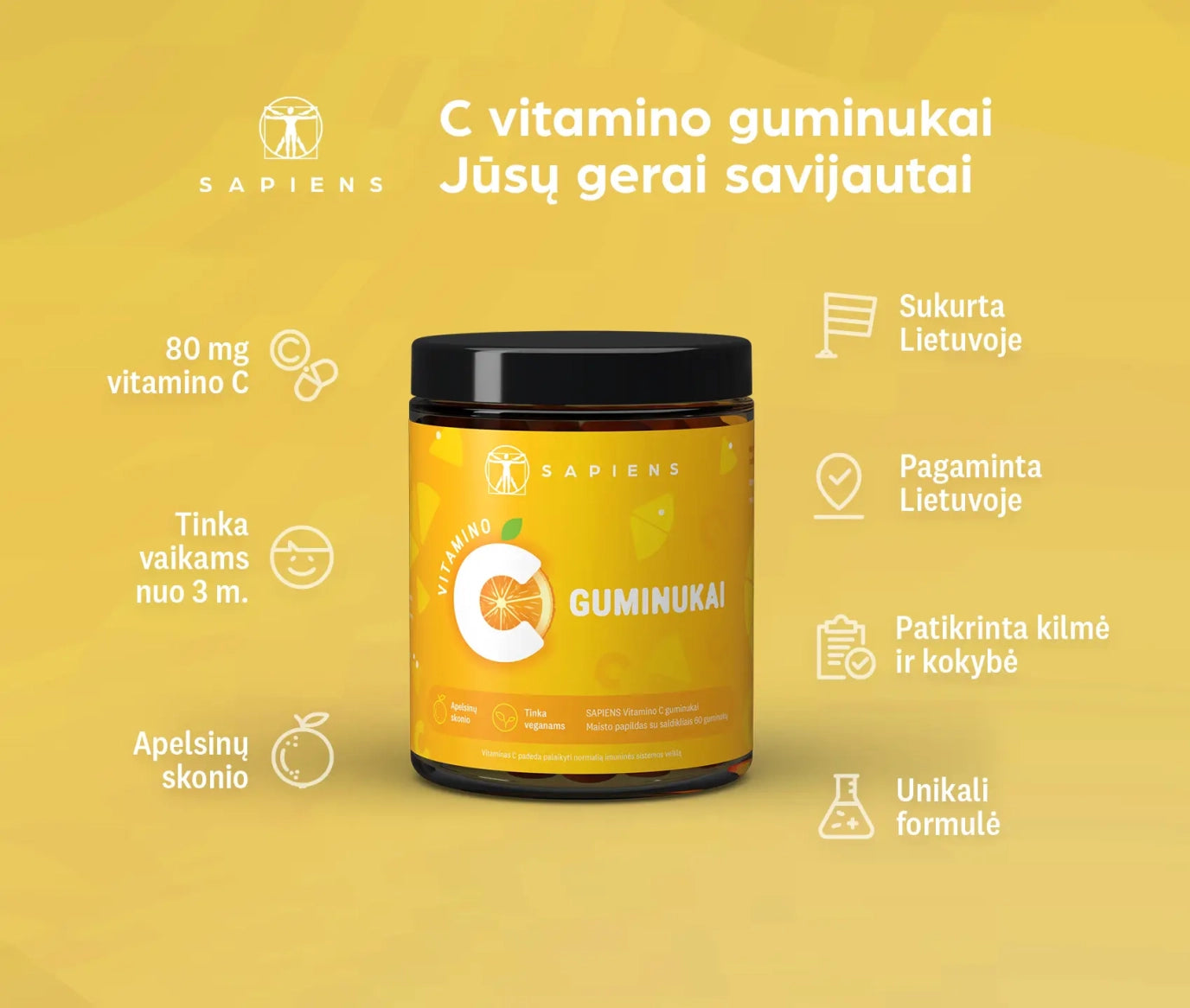 SAPIENS Vitamino C guminukai – skanus būdas papildyti mitybą šiuo itin svarbiu vitaminu! Papildo sudėtis suderinta visai šeimai ir tinka vartoti vaikams nuo 3 metų amžiaus. Malonaus apelsinų skonio guminukai, puikus pateikimas, jei sunku nuryti tabletes ar kapsules. Vitaminas C svarbus ne tik imuninei sistemai (Vitaminas C padeda palaikyti normalią imuninės sistemos veiklą), bet ir odai (Vitaminas C padeda palaikyti normalų kolageno, kuris reikalingas normaliai odos funkcijai, susidarymą).