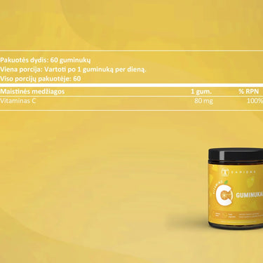 Maisto papildas pateikiamas vaikų ir suaugusiųjų pamėgta guminukų forma! Malonaus apelsinų skonio Vitamino C guminukų sudėtyje nėra gyvūninės kilmės produktų, todėl papildas yra tinkamas besirenkantiems vegetarišką ar veganišką mitybą. Tinkamas vaikams nuo 3 metų amžiaus.