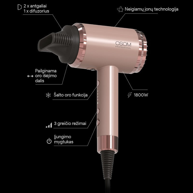 Osom Professional „Hair Dryer“ plaukų džiovintuvas turi integruotą pažangią neigiamų jonų generavimo technologiją. Dėl jos šiuo prietaisu džiovinami plaukai tampa žvilgantys ir glotnūs, o pažeisti plaukai – gyvybingesni. Plaukų džiovintuvas pasižymi didele 1800 W galia, 3 greičio nustatymo režimais, pailginama oro išėjimo dalimi, šalto oro funkcija šukuosenos užbaigimui bei patogiai keičiamais antgaliais.
