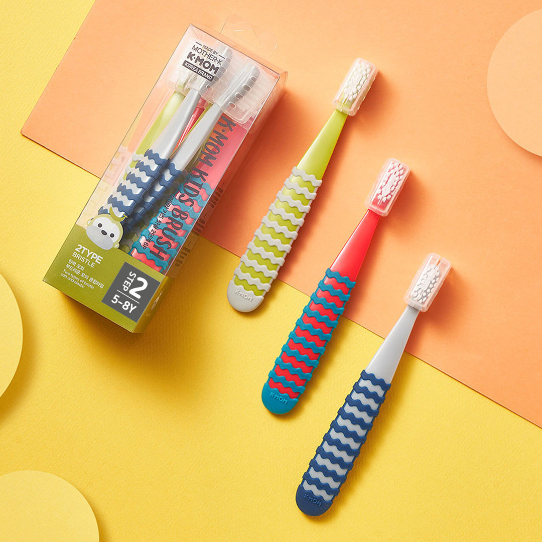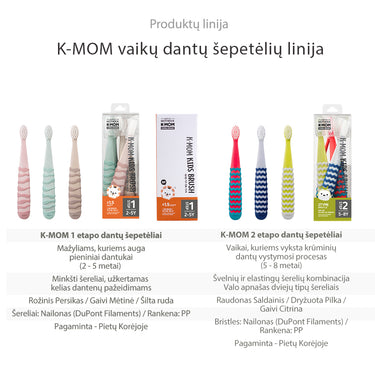 Augant vaikui, keičiasi ir jų dantų bei dantenų struktūra. K-MOM dantų šepetėliai pritaikyti būtent vaikams. Minkštų ir elastingų šerelių derinys, skirtas pašalinti apnašas ir skatinti sveiką dantenų priežiūrą nuo 5 metų amžiaus. Dantų šepetėlių galvutės skirtingos ir pritaikytos pagal amžių.