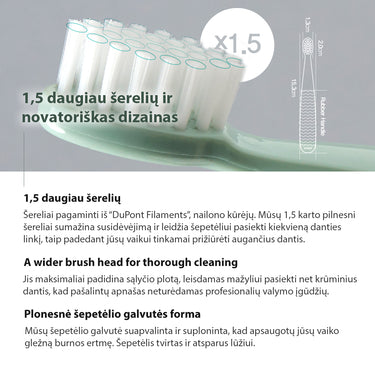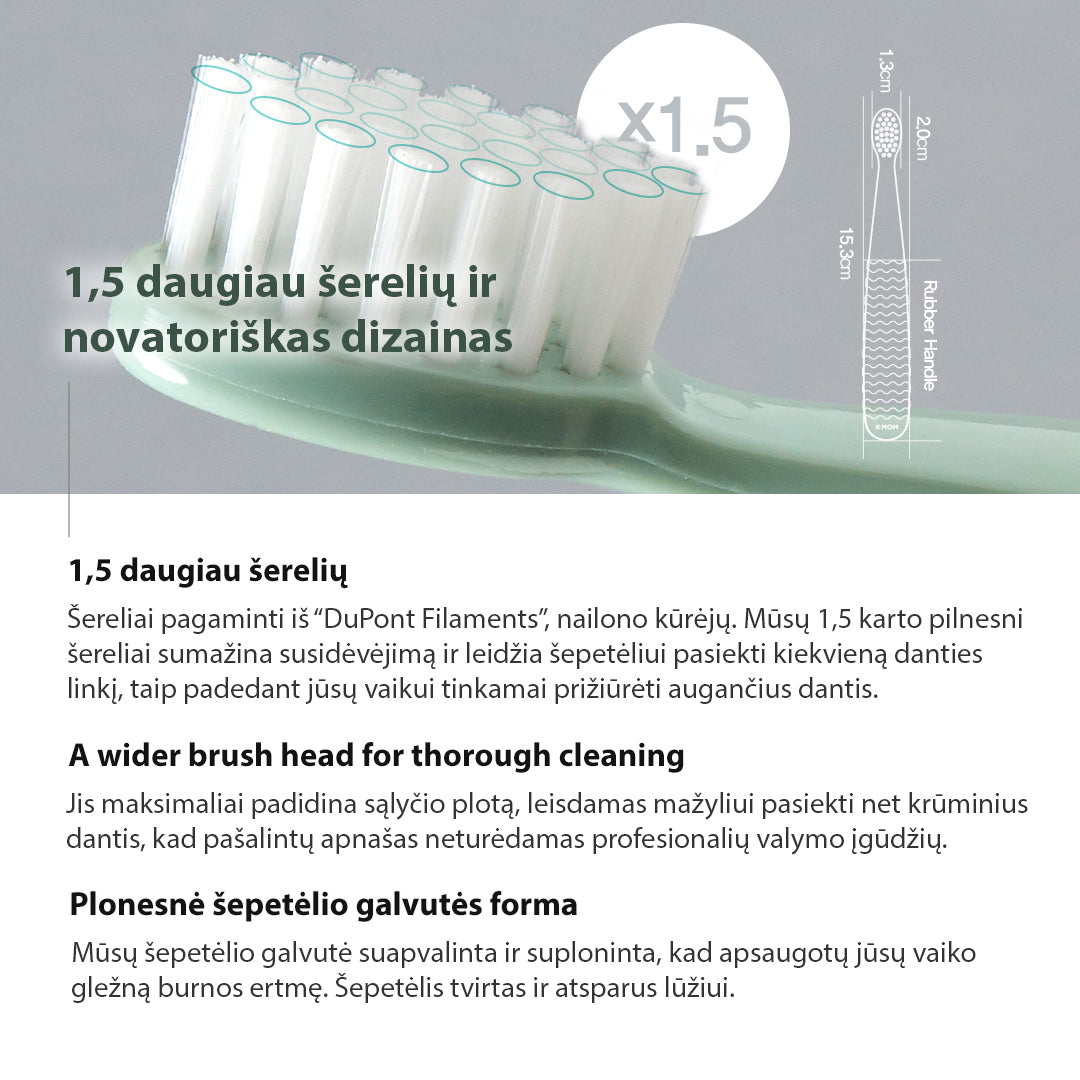 Minkštų ir elastingų šerelių derinys apsaugo dantenas ir pašalina apnašas, kol vaikai pereina prie nuolatinių dantų. Elastingi viduriniai šereliai efektyviai šalina apnašas, o minkšti išoriniai šereliai saugo dantenas nuo pažeidimų.