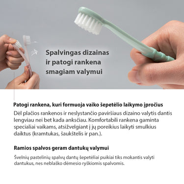 • Ypač patogi rankena. Pritaikyta vaikams puikiai patirčiai prižiūrint dantis savarankiškai.