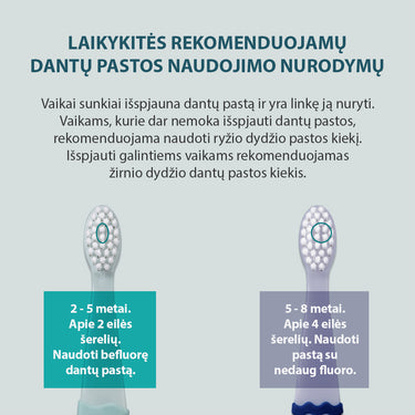 Dantų šepetėlius, kurie atitinka vaiko dantų poreikius kiekviename jų vystymosi etape.