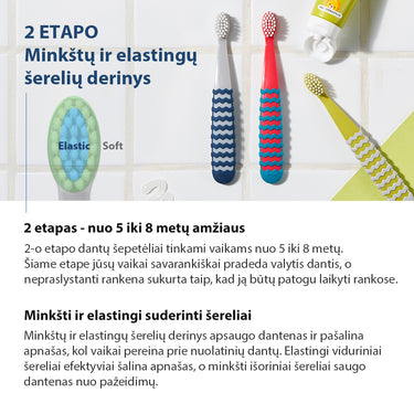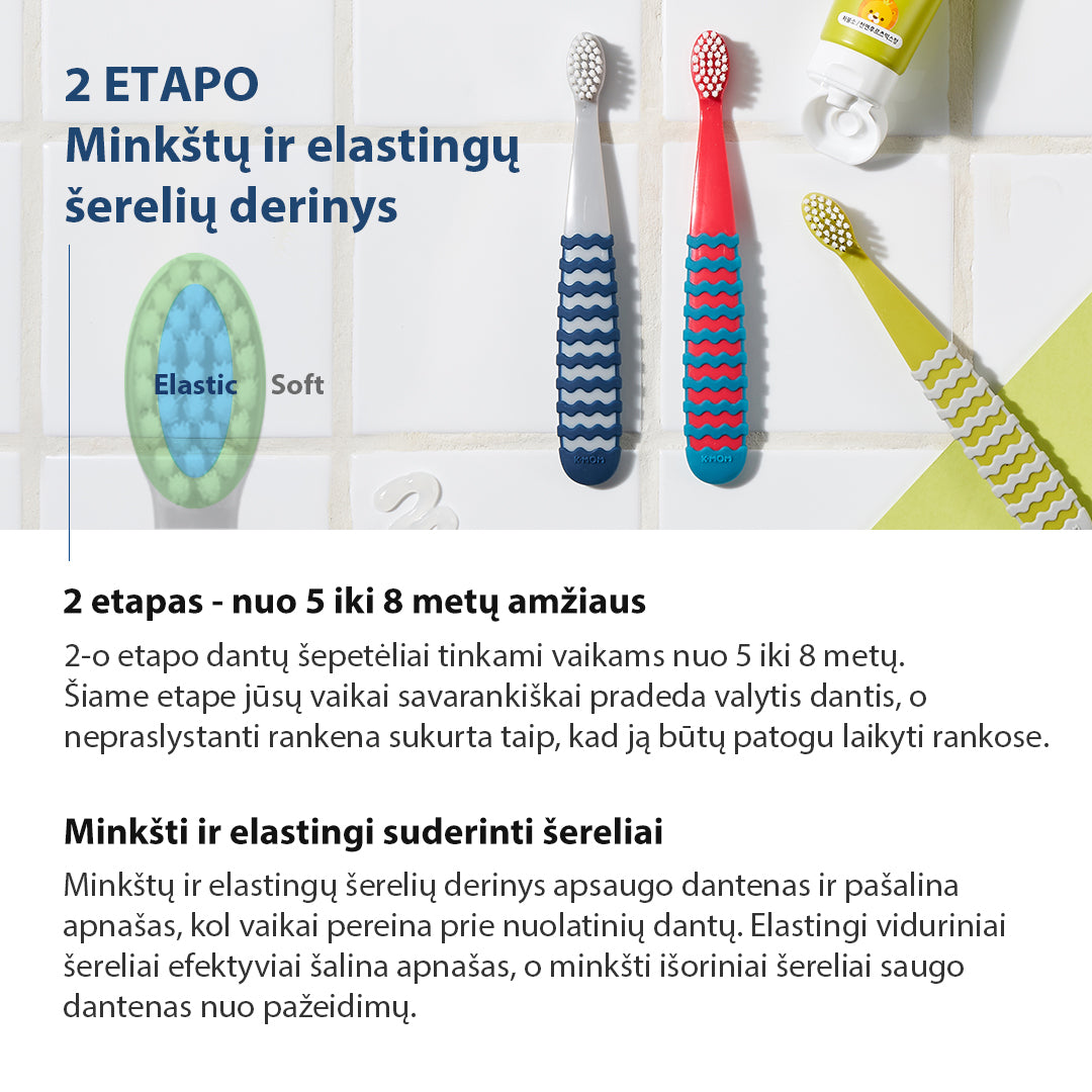 2-o etapo dantų šepetėliai tinkami vaikams nuo 5 iki 8 metų. Šiame etape jūsų vaikai savarankiškai pradeda valytis dantis, o nepraslystanti rankena sukurta taip, kad ją būtų patogu laikyti rankose.