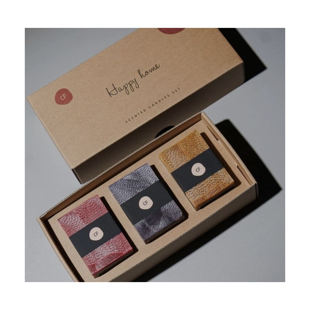 Trijų skirtingų kvapų žvakių rinkinys supakuotas stilingoje natūralaus kartono dėžutėje yra puiki dovana ir sau, ir savo artimajam.