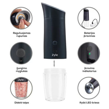 Nuo šiol su šiuo „Zyle“ elektriniu malūnėliu druską ir pipirus sumalsite dar greičiau. Tiesiog nusukite apatinį indelį, pripilkite į jį norimos sumalti druskos ar pipirų, apverskite prietaisą ir jis automatiškai pradės malti. Kad būtų dar patogiau, šis druskos ir pipirų malūnėlis yra įkraunamas – jums tiesiog reikės prijungt USB laidą ir prietaisas pasikraus.