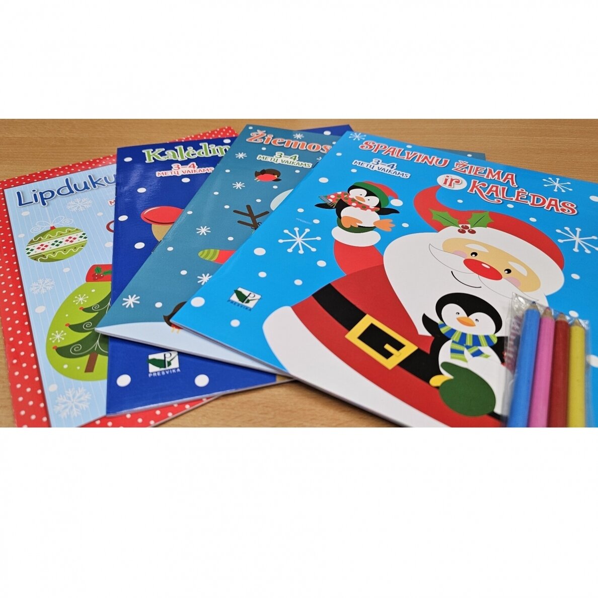 Kalėdinis rinkinys. Kalėdų džiaugsmai. 3-4 metų vaikams. 4 knygelės, 140 lipdukų, 30 iškilių lipdukų, 4 spalvoti pieštukai